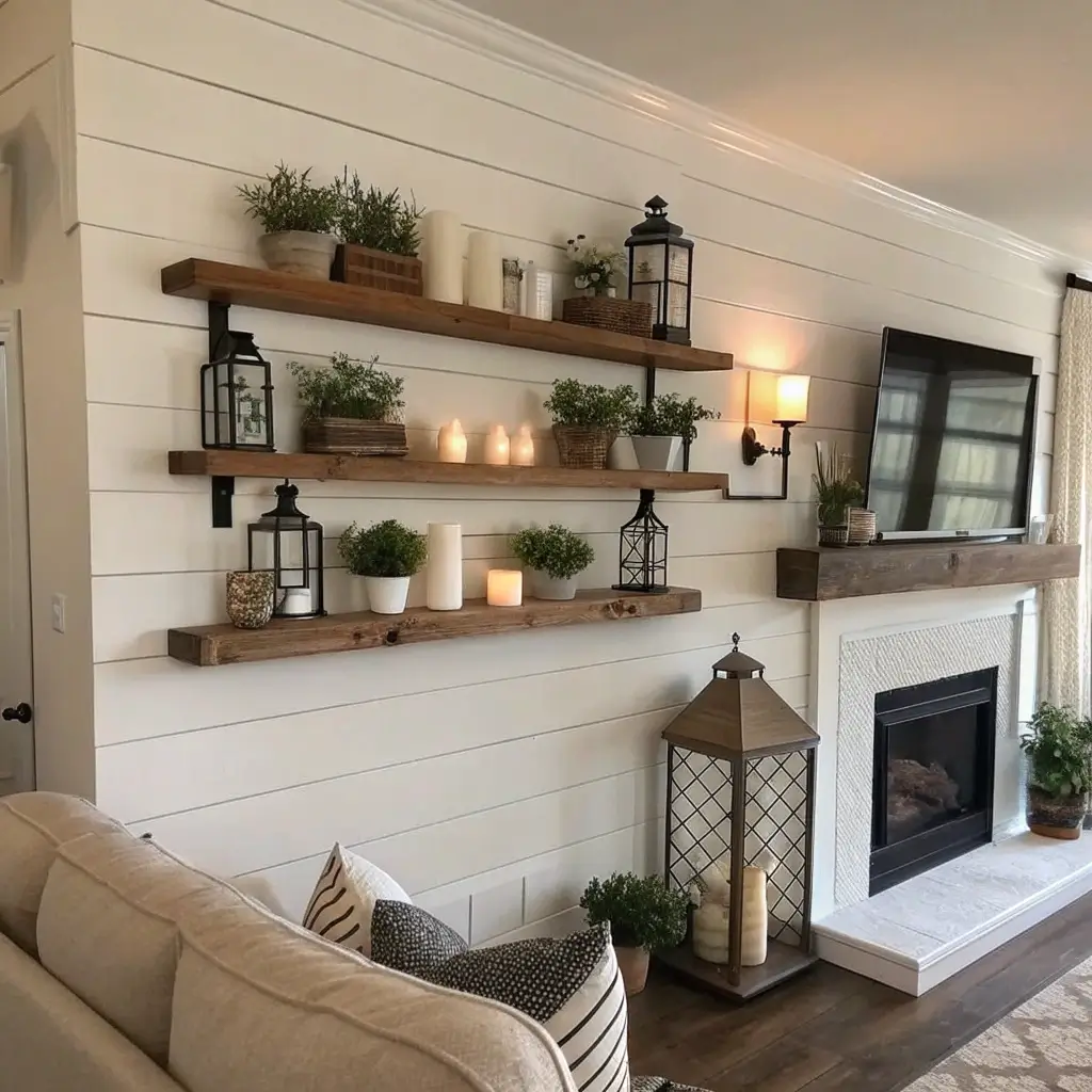 Shiplap Accent Wall with Floating Shelves