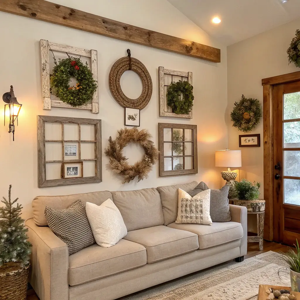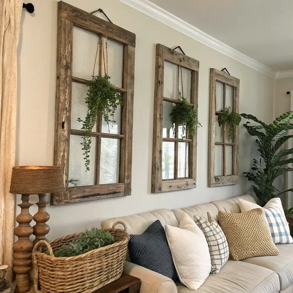 Old window frames are farmhouse gold. They add architectural interest without the commitment of actual renovation. I scored mine from a salvage yard for $15 each, and they’re now the centerpiece of my accent wall.