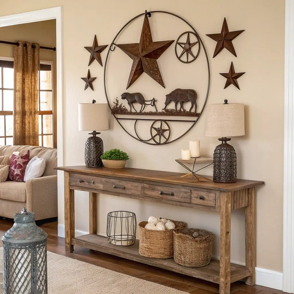 I prefer abstract metal pieces – maybe a windmill silhouette or geometric barn stars. They’re less literal but still nail that farmhouse vibe. Black metal against white walls? Chef’s kiss. Galvanized metal adds authentic farm feel if your decor leans more rustic.