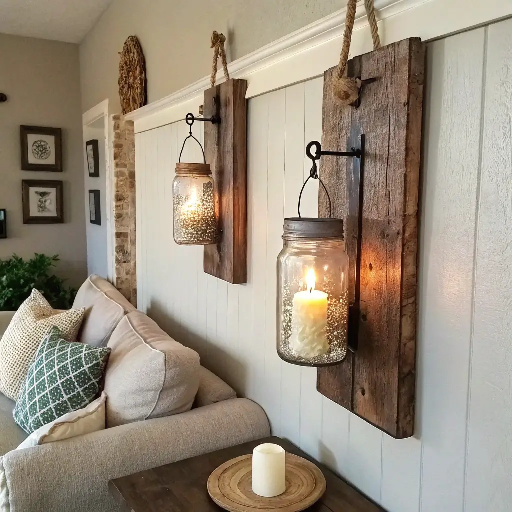 Mason jar sconces scream farmhouse, and making them yourself saves serious cash. Each sconce costs about $10 to make versus $30+ to buy. Plus, you get bragging rights when guests compliment them.