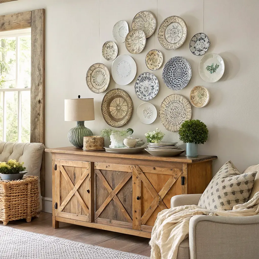 Start with 8-10 plates in varying sizes. Stick to a color scheme – all white, blue and white, or earth tones. Paper templates are your friend here. Cut circles the size of your plates, tape them to the wall, and play with arrangements before committing to nail holes.