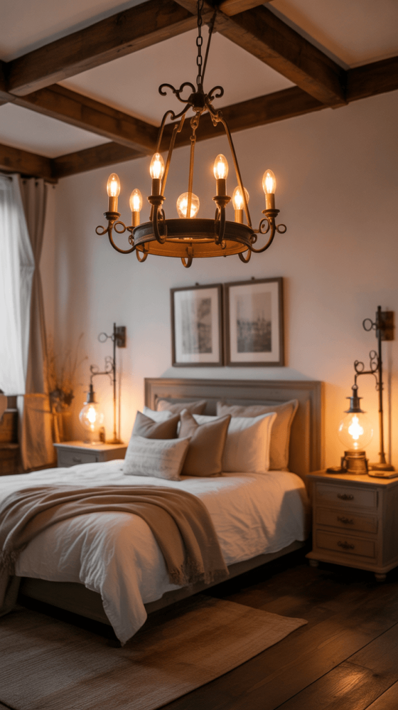 For a farmhouse bedroom, you want lighting that feels soft, warm, and a little bit historic.