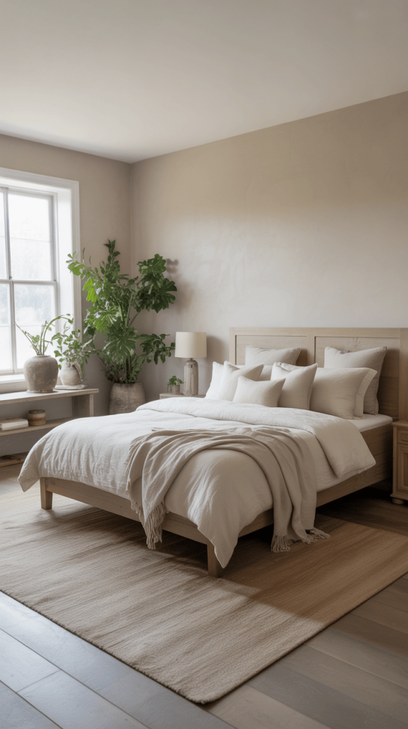 - Layer those neutrals. The magic happens when you layer different shades of white and beige. An off-white duvet cover, cream-colored curtains, a chunky knit throw in natural oatmeal—these subtle variations add depth and sophistication without any drama.