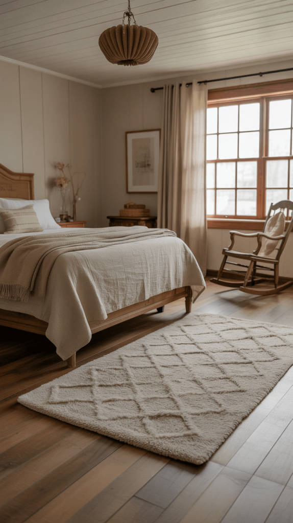 Even if you have beautiful hardwood floors, a rug is essential. It defines the sleeping area, adds a massive dose of softness and warmth underfoot (crucial for those cold mornings!), and absorbs sound, making the room feel quieter and more serene.