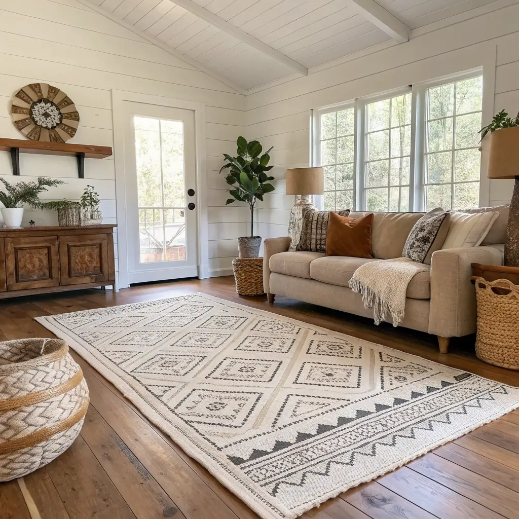 Boho-Farmhouse Rug Combinations for Living Rooms