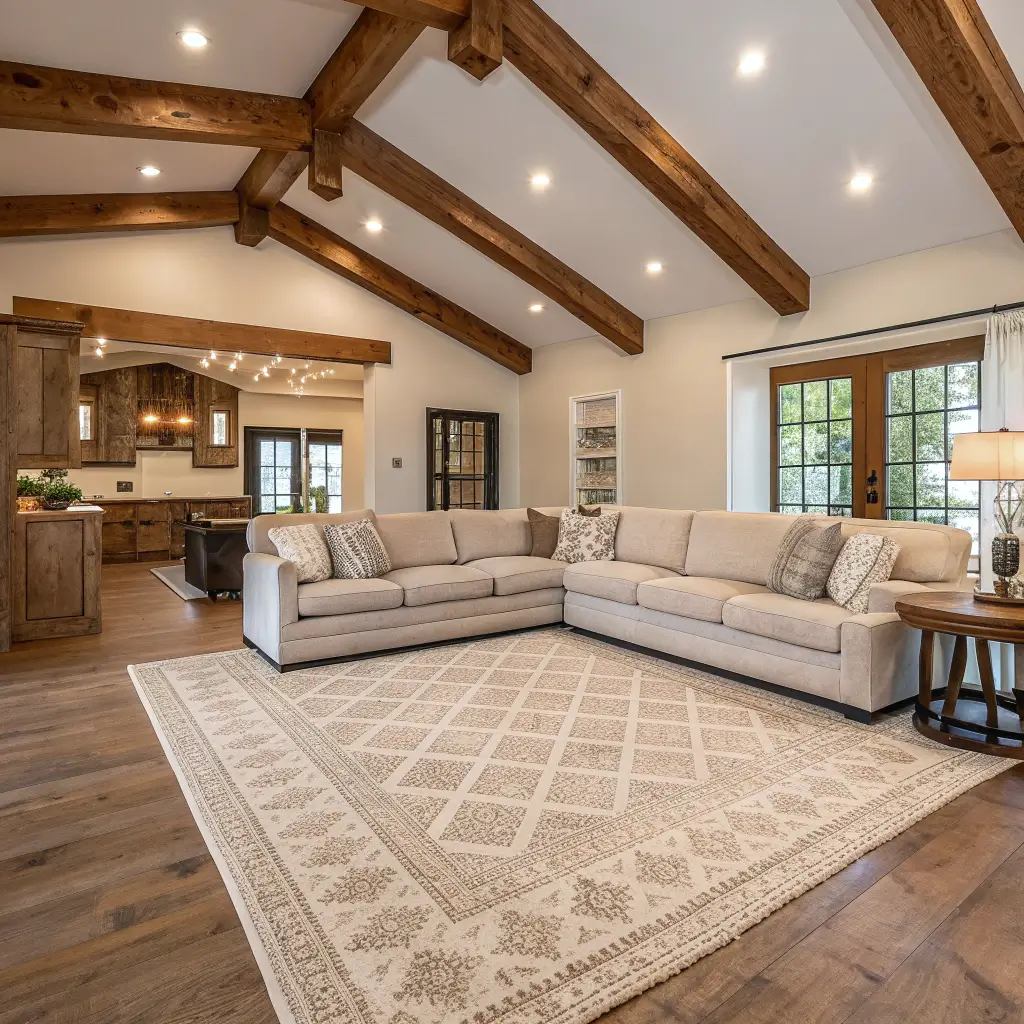 Think 12×15 or even larger if your room can accommodate it. The rug should extend beyond your coffee table and reach under all furniture pieces in your conversation area. This creates a cohesive zone within the larger space.