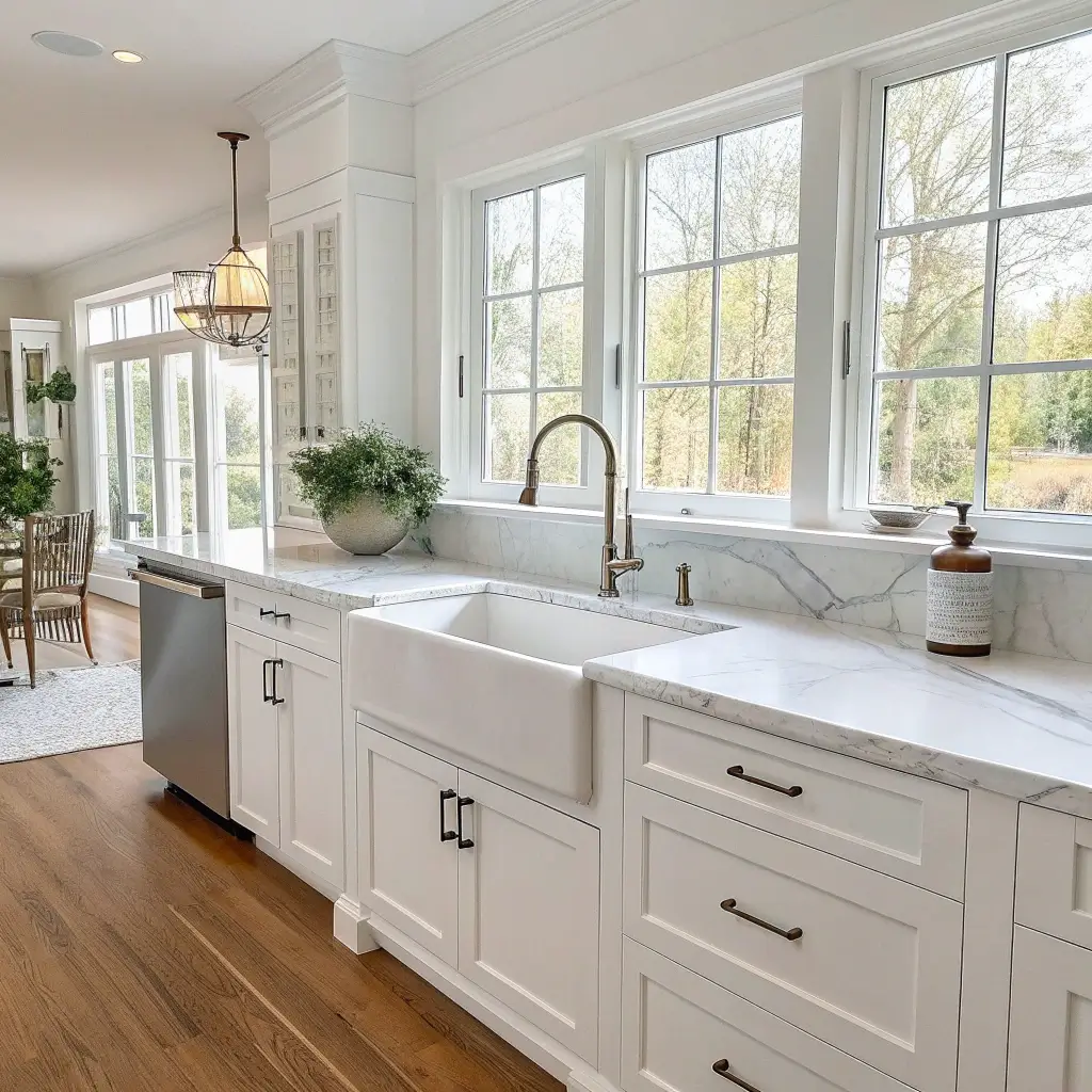 The key to nailing this look? Let the marble be the star while the sink plays a stunning supporting role. White Carrara marble with its subtle gray veining pairs beautifully with a white farmhouse sink, creating this seamless, sophisticated look that never gets old.