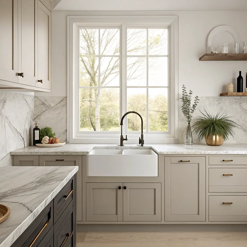 Let’s be honest about marble for a second. Yes, it needs sealing. Yes, it can stain. But does it look absolutely stunning with a farmhouse sink? Also yes. If you’re worried about maintenance, consider quartzite instead – it looks like marble but acts like granite.