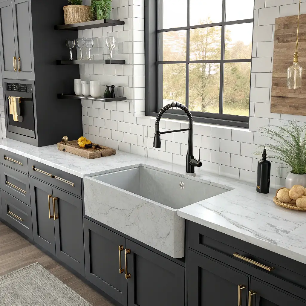 Industrial farmhouse combines raw materials with rustic charm, creating kitchens that feel both edgy and welcoming. Stainless steel or concrete farmhouse sinks perfectly capture this aesthetic.
