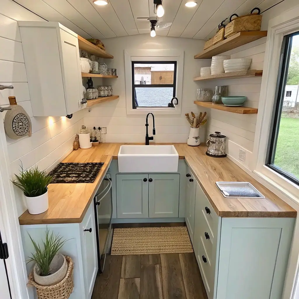 Ever considered a corner farmhouse sink? They exist, and they’re genius for tiny kitchens. You get all the farmhouse charm while maximizing every inch of counter space. Pair it with a corner lazy Susan below, and you’ve got storage that actually makes sense.