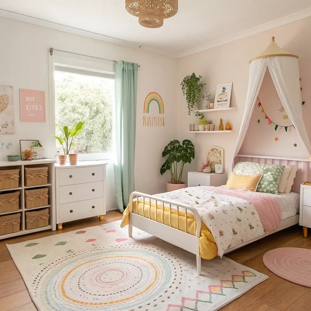 Kids’ bedrooms need to be fun without being overstimulating. Limit bright colors to accents and play areas, keeping the sleep zone calm. Use storage boxes to hide toys at bedtime, transforming the space from playroom to bedroom.