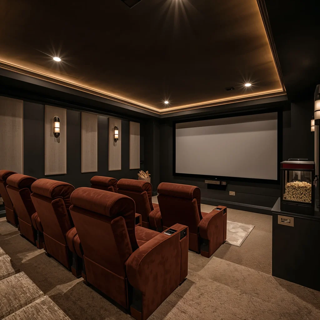 The trick to a great home theater basement? Warm lighting and textures. I installed dimmable LED strips behind my screen and along the baseboards. When they’re set to a warm amber during movie intermissions, the whole space feels inviting rather than dungeon-like. Throw in some plush throw blankets, a mini-fridge for snacks, and maybe a popcorn machine if you’re feeling extra, and you’ve got yourself a legitimate cinema experience.