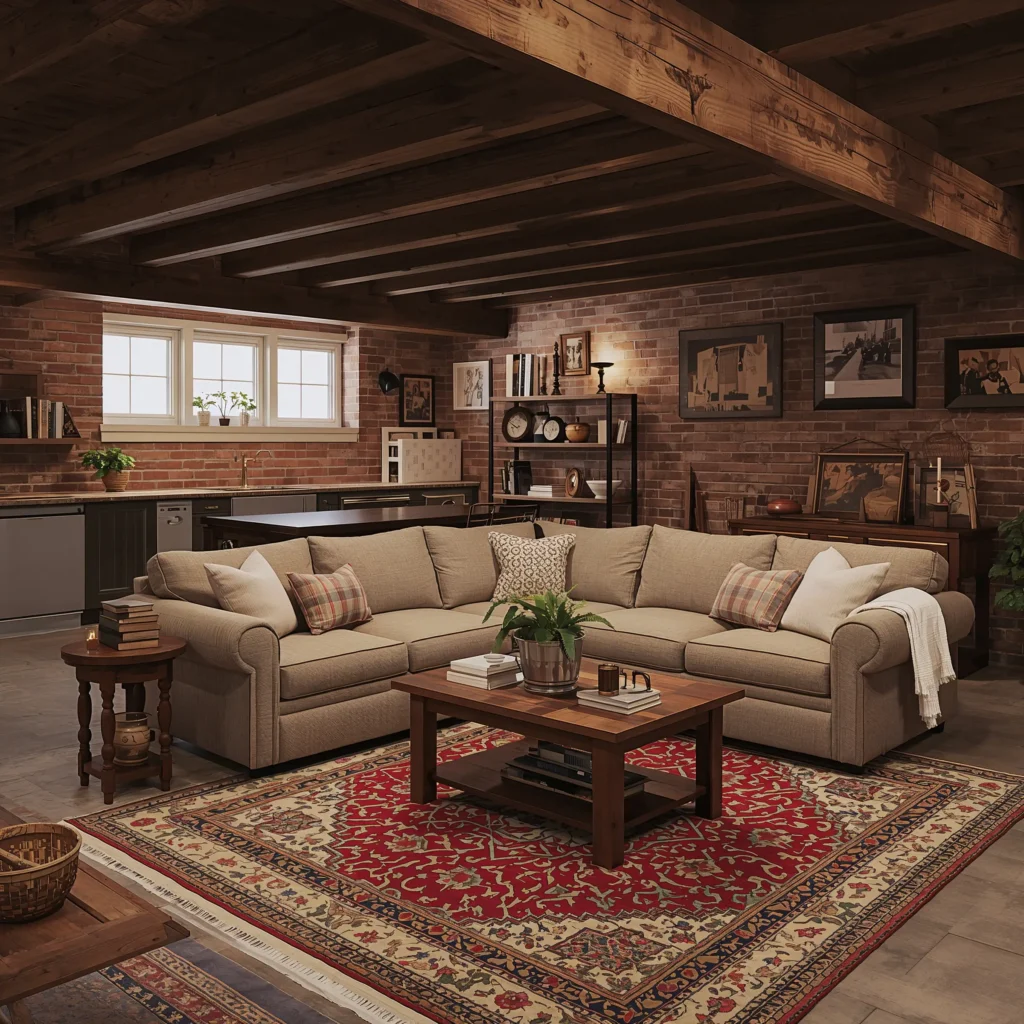 Farmhouse style screams comfort. Oversized sectionals with washable slipcovers, chunky knit throws, and enough pillows to build a fort – that’s what makes people actually want to hang out in your basement. Add a rustic coffee table made from reclaimed barn door (or a $200 knockoff from Target that looks identical), and you’ve nailed the aesthetic.