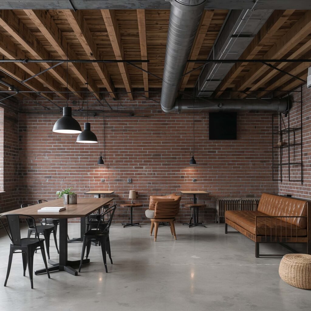 Pure industrial can feel cold, so you need elements that add warmth. Leather furniture ages beautifully and fits the aesthetic perfectly. Area rugs define spaces and absorb sound (concrete echoes like crazy). And despite what you might think, plants absolutely work in industrial spaces – they create amazing contrast against all that metal and concrete.