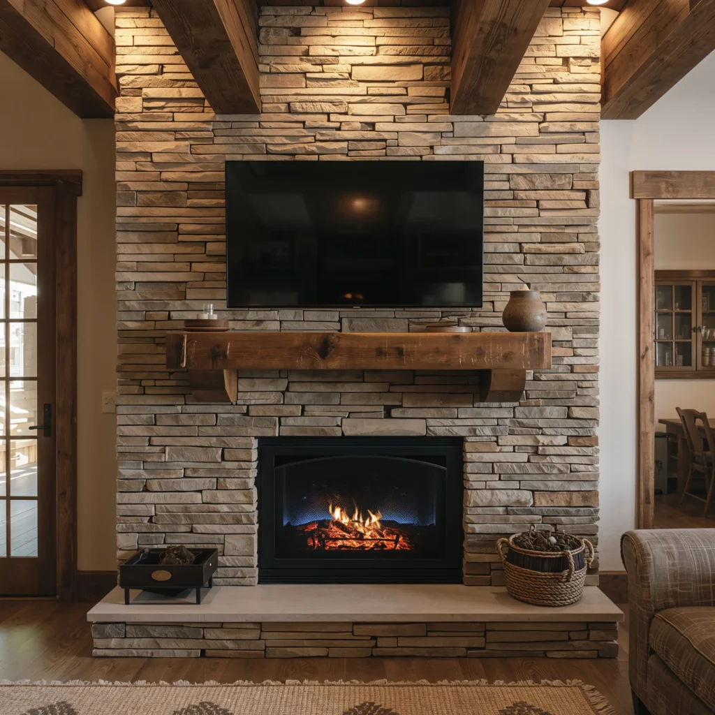 Rustic Stone Fireplace with Above-TV Wood Mantel