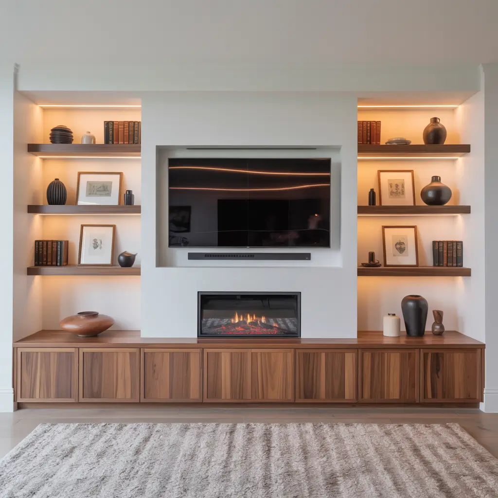 The magic happens when you design the built-ins as one cohesive unit rather than separate pieces. Your fireplace sits in the center at floor level, your TV mounts in the perfect viewing position above it, and custom shelving extends on both sides to create symmetry and storage.