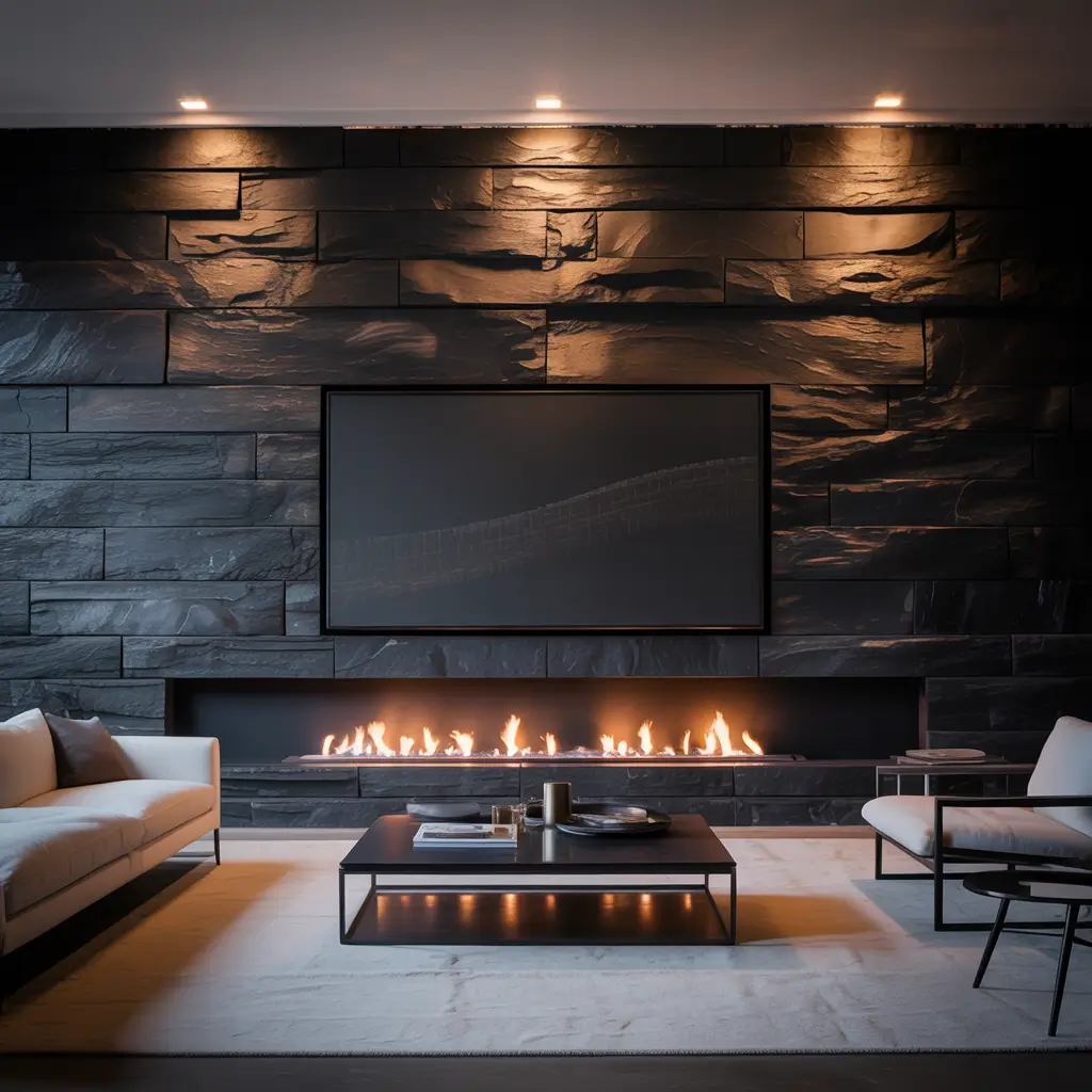 Black granite, slate, or even painted steel creates this incredible monolithic appearance that’s both bold and elegant. The fireplace and TV area become one continuous surface, creating a striking focal point that dominates the room in the best possible way.