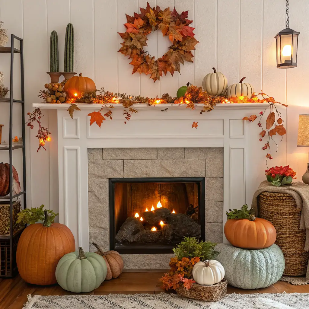 Seasonal Fall Pumpkin Mantle Decor Setup