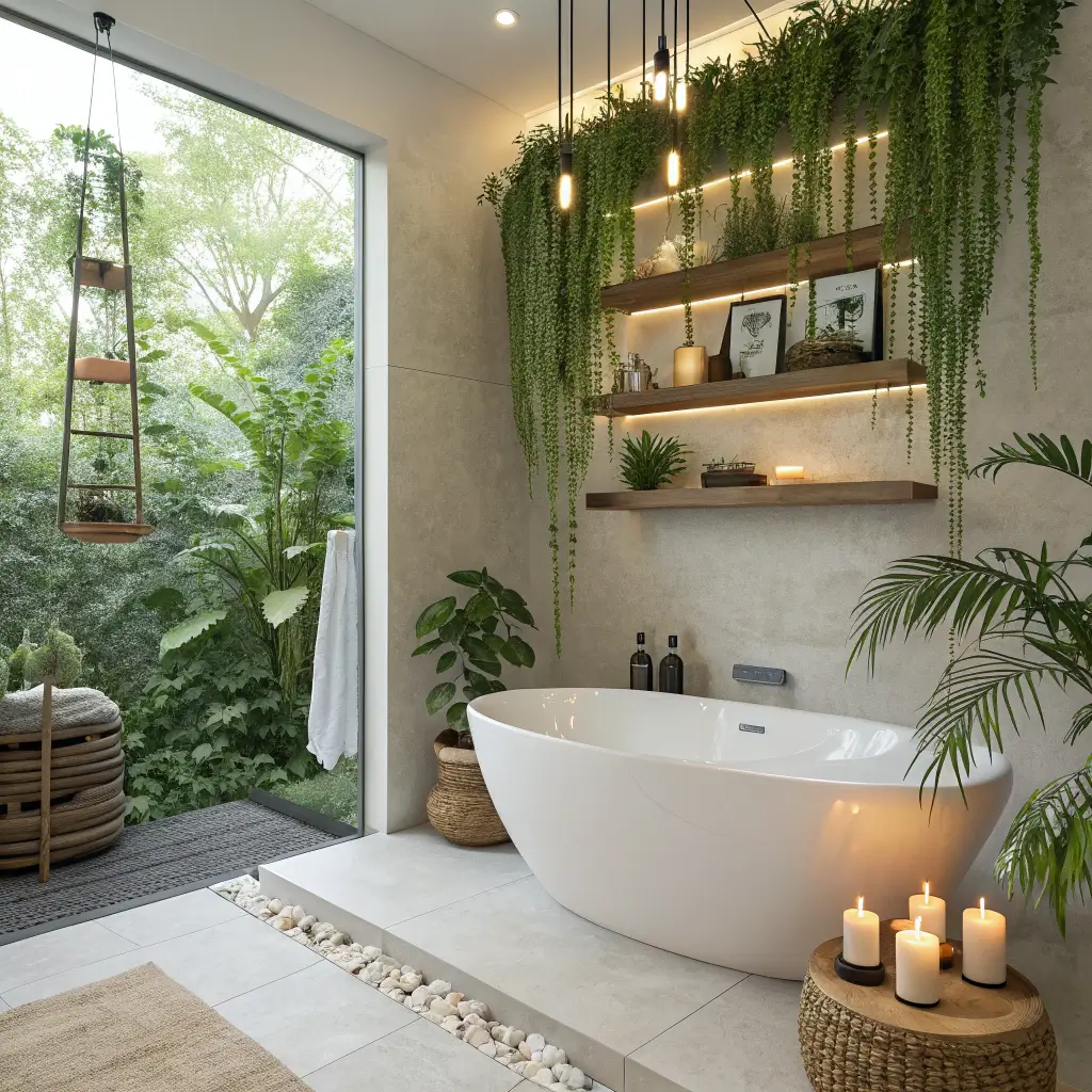The key here? Choose plants that actually thrive in humid environments. Pothos, spider plants, and Boston ferns love bathroom conditions. The combination of weathered wood and lush greenery creates this whole earthy, organic feel that makes you want to soak for hours.