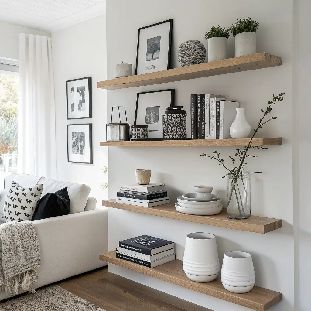 What makes floating shelves so addictive? They give you vertical storage without eating up floor space, and you can change up the decor whenever you get bored. Plus, installing them makes you feel like a DIY champion even if you can barely operate a drill 🙂