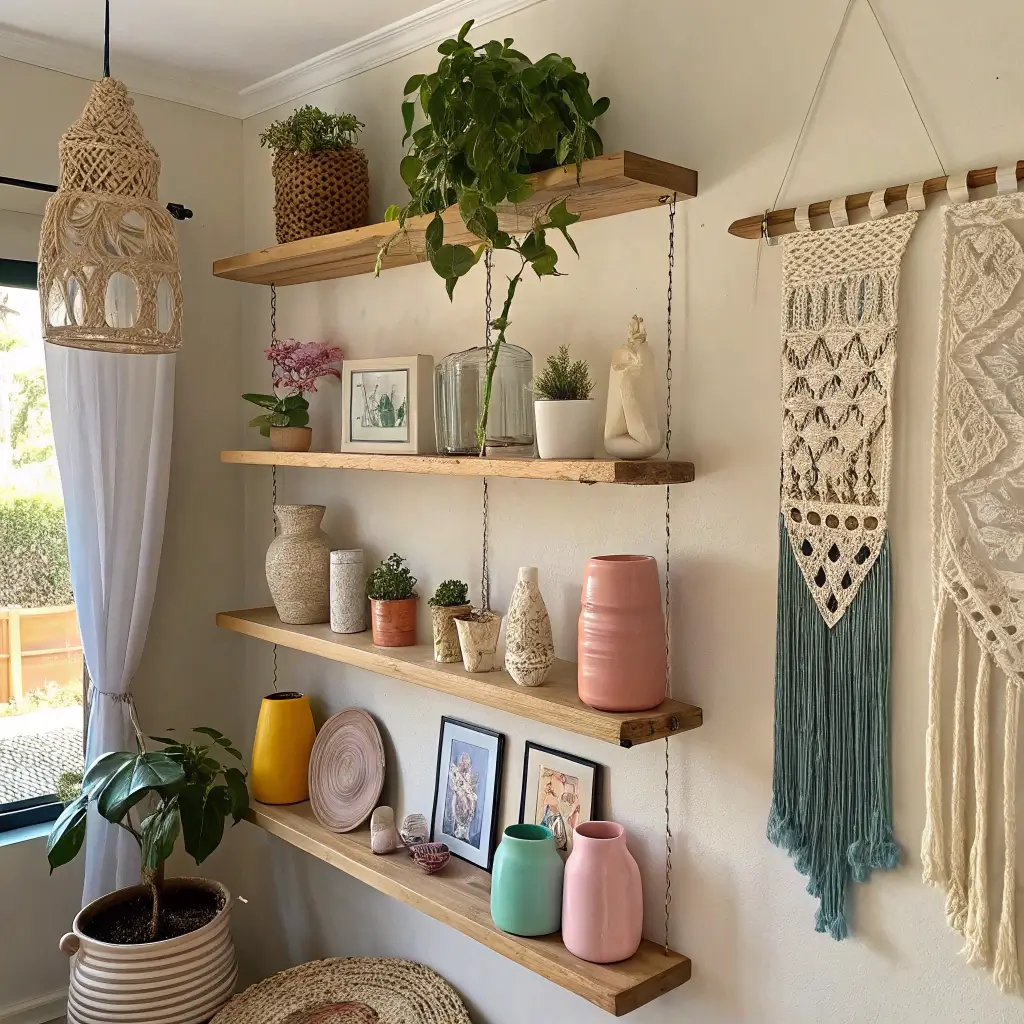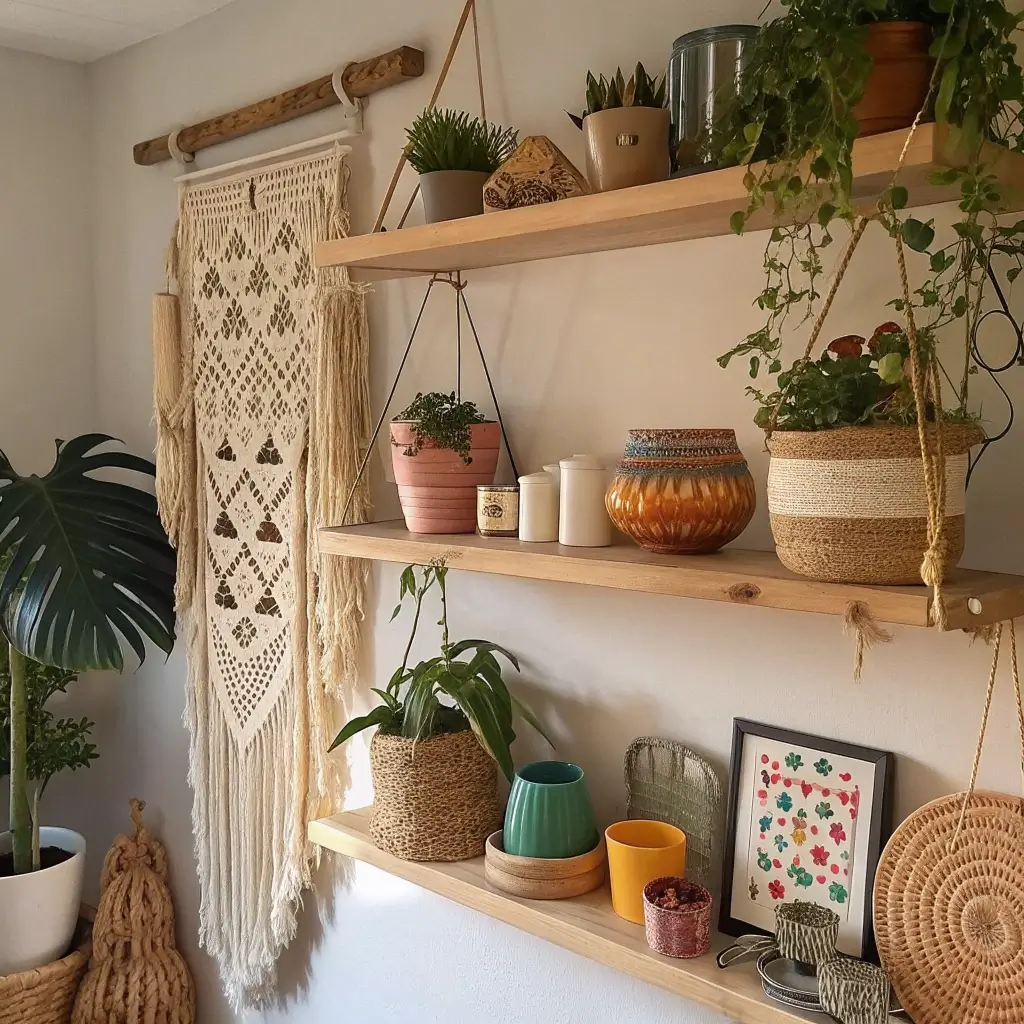 Start with woven baskets, macramé plant hangers, and dried pampas grass. Layer in some vintage books with worn spines, throw in a few crystals if that’s your vibe, and add wooden or ceramic pieces with organic shapes. The goal? Creating shelves that look like they evolved naturally over time.