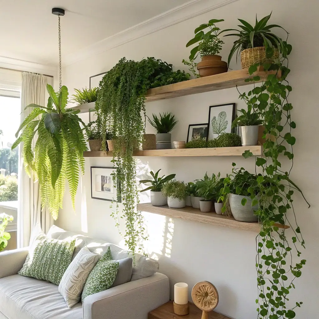 Mix trailing plants like pothos or string of pearls with upright options like snake plants or succulents. Vary your planters too—ceramic, terracotta, hanging macramé, even repurposed containers add personality. The combination creates a living wall that literally grows more beautiful over time.
