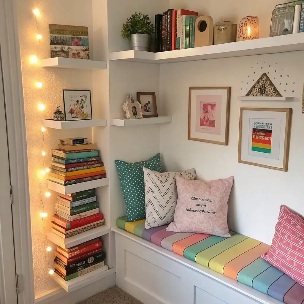 Mix toy storage with book display, adding colorful bookends shaped like animals or favorite characters. Include clear containers for small toys—kids can see what’s inside and might actually put things back. Display artwork, trophies, and treasures that make kids feel proud of their space.