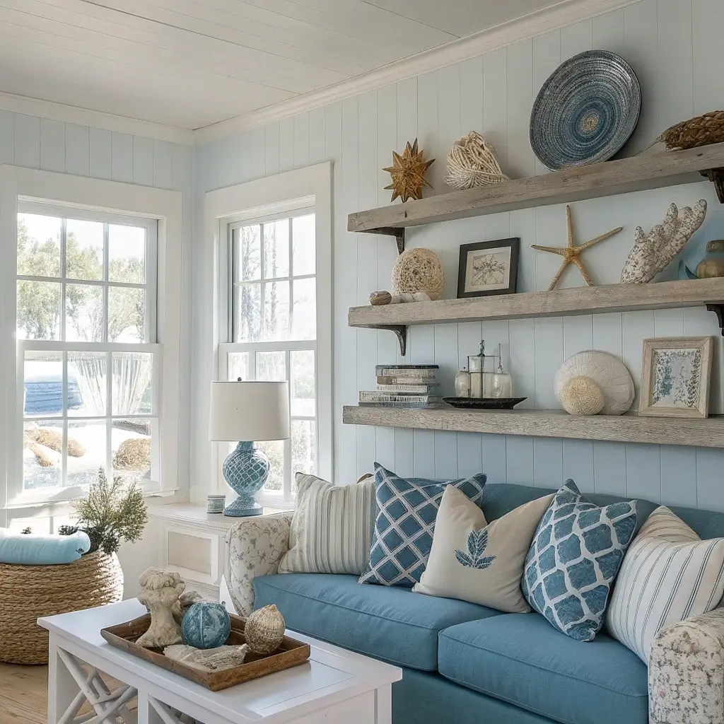 Missing the beach? Same. But coastal-themed floating shelves bring ocean vibes inland without the sand in uncomfortable places. This style works anywhere, even if the closest beach requires a plane ticket.