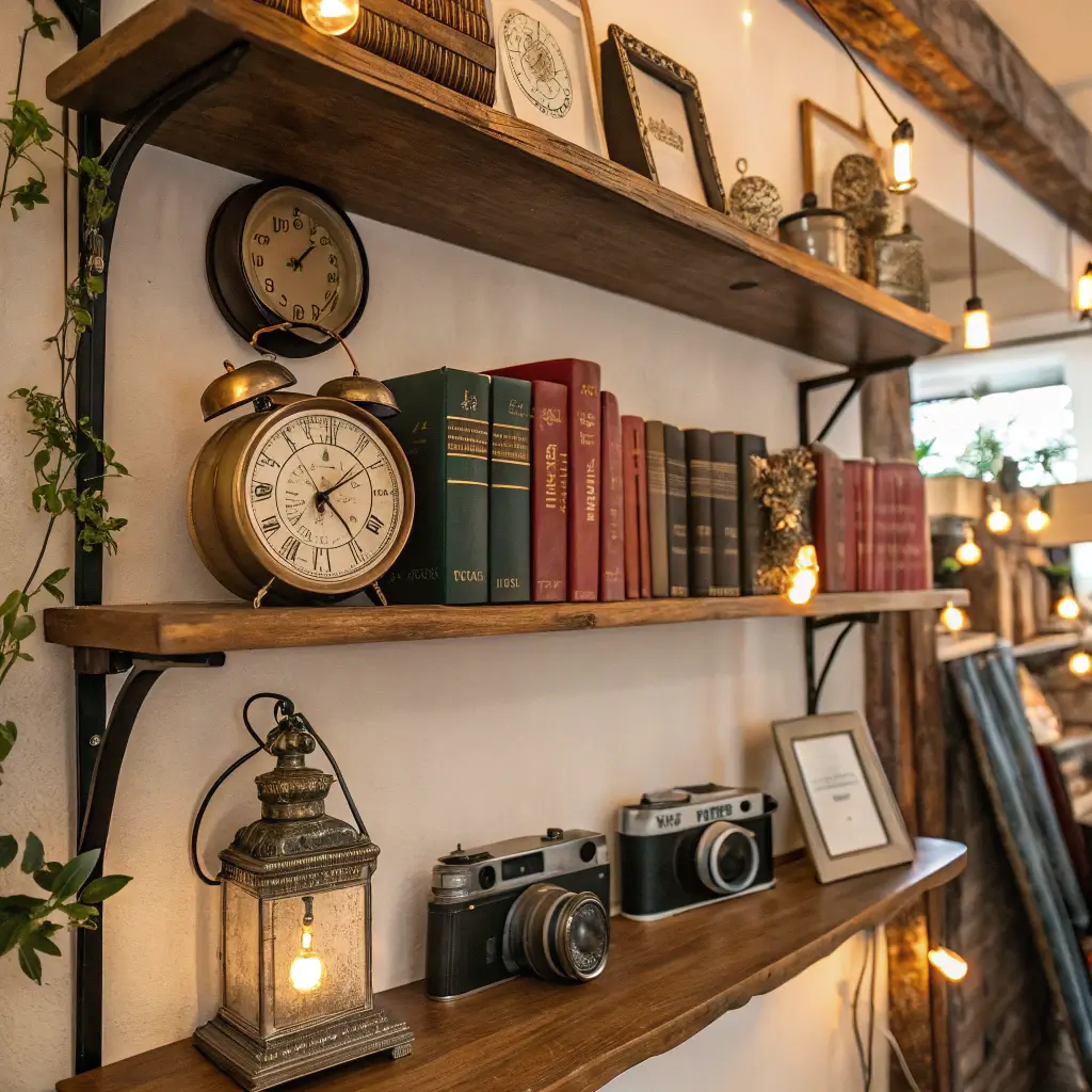 Whether you collect vintage cameras, antique books, retro toys, or mid-century ceramics, floating shelves let you curate mini museums on your walls. Group similar items together for impact, or mix different collections for an eclectic vintage vibe.