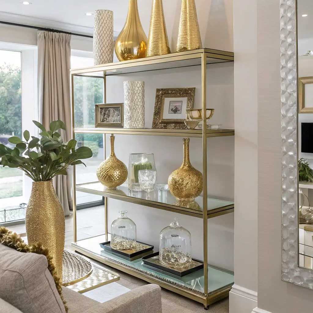 Want shelves that sparkle without looking like a disco ball exploded? Metallic and glass combinations create sophisticated glamour that catches light beautifully. This style works especially well in smaller spaces where you need maximum impact without visual weight.