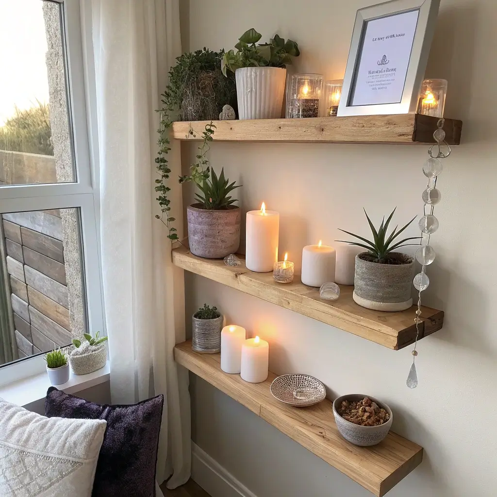 Include elements that engage different senses. A small essential oil diffuser, textured stones for tactile interest, or a tiny tabletop fountain for soothing sounds. Your shelves become a multi-sensory retreat that calms more than just your eyes.