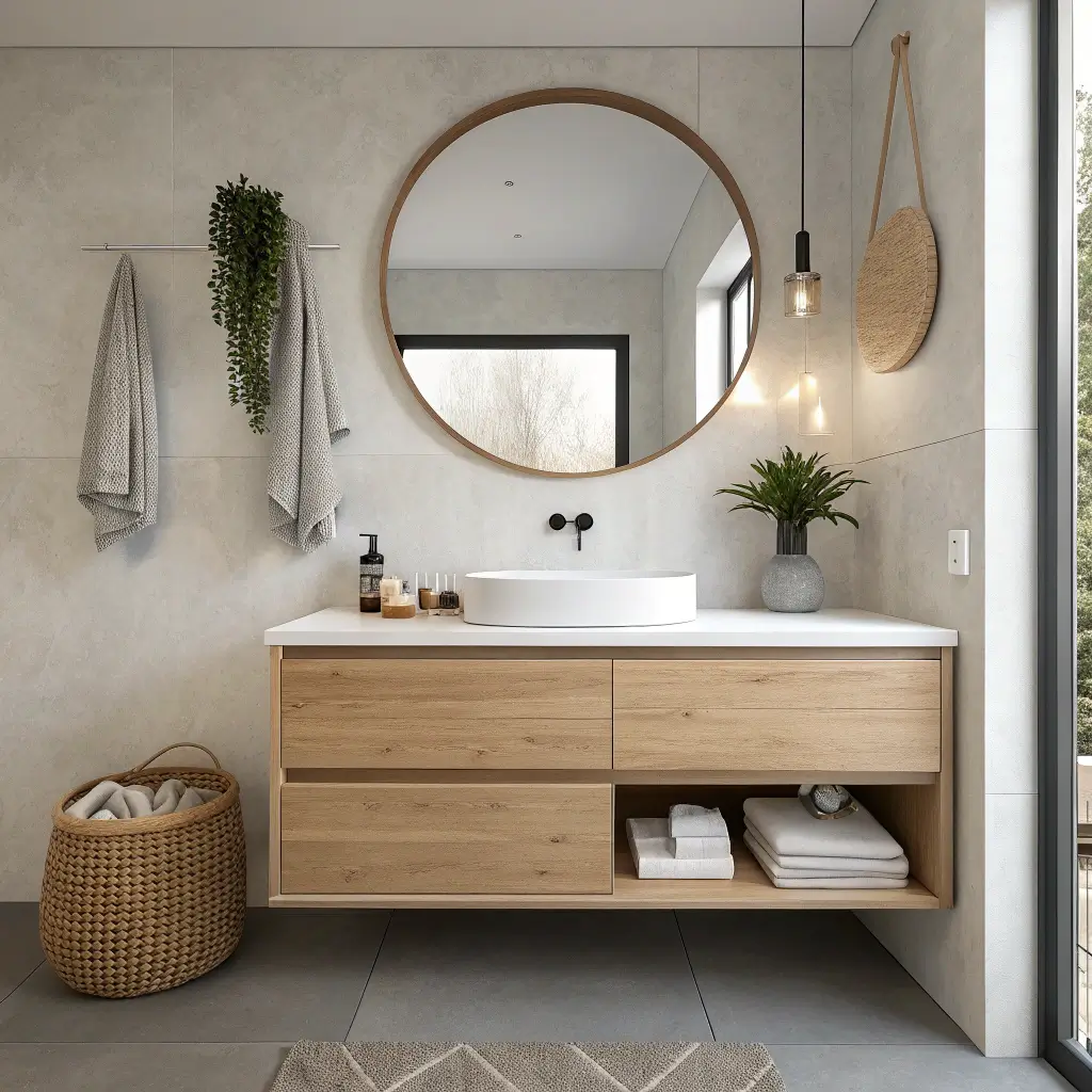 The Scandi approach focuses on light woods, white surfaces, and absolutely zero clutter. Everything has a purpose and a place. It’s minimalism with warmth – like a cashmere sweater for your bathroom.