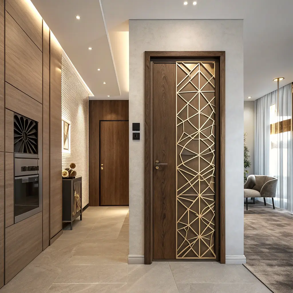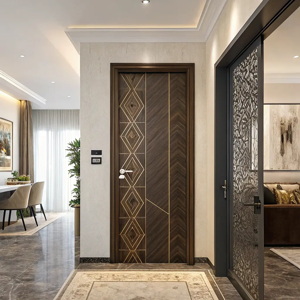 Geometric inlays turn flush doors into functional art pieces. Whether you prefer subtle tone-on-tone patterns or bold contrasting designs, geometric inlays add visual interest without overwhelming the space.