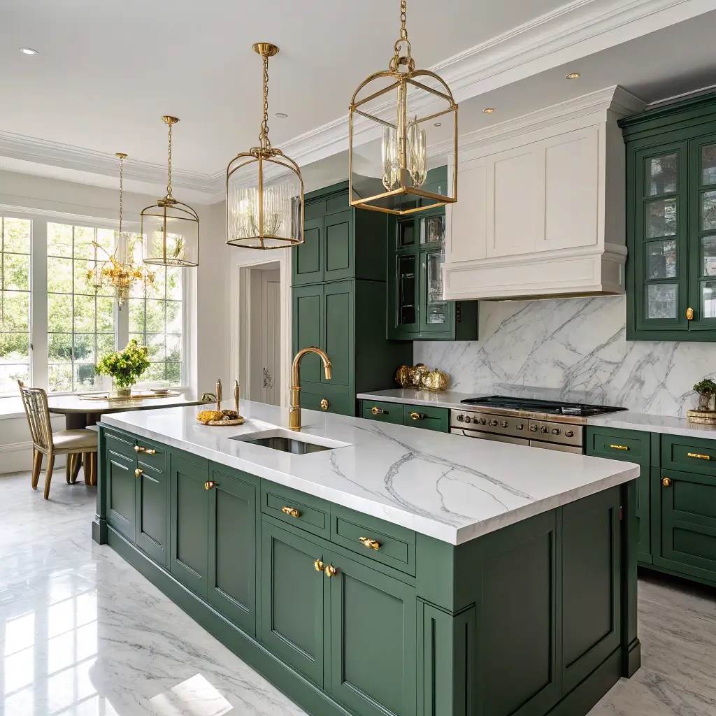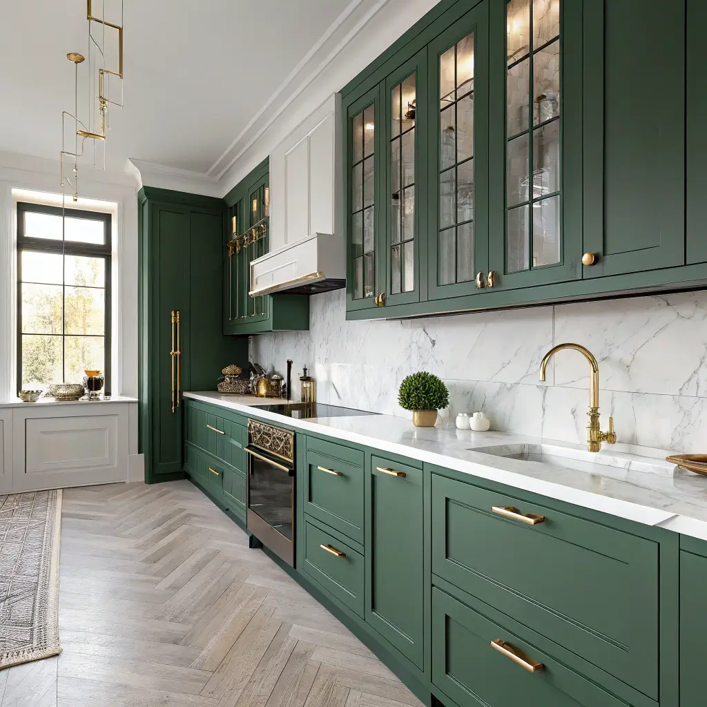 Forest Green Cabinets with Gold Accents