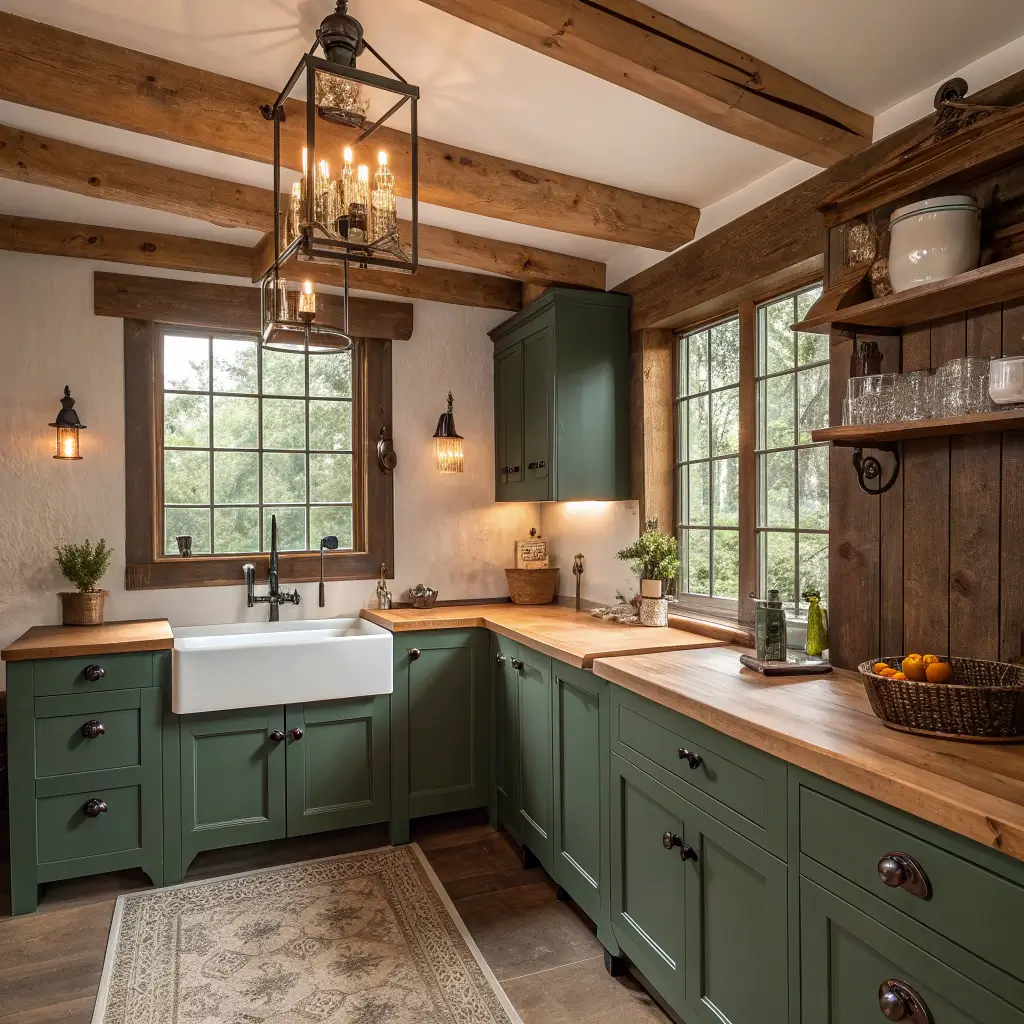 Exposed wooden beams, apron-front sinks, and forest green cabinets create that lived-in warmth everyone craves. Add some open shelving displaying mason jars and vintage dishes, and you’ve nailed the aesthetic. This style works because it feels authentic, not forced.