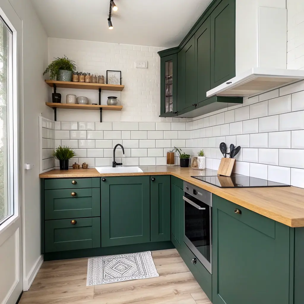 Think forest green overwhelms small spaces? Think again! Dark colors actually create depth when used strategically. My studio apartment’s tiny kitchen proves this point beautifully.