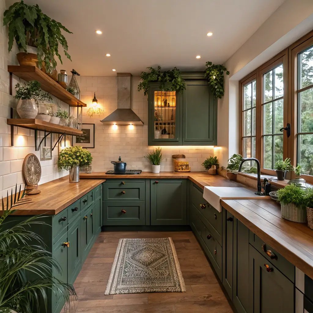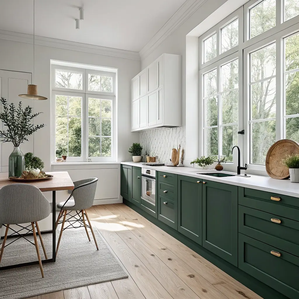 Natural wood paired with forest green creates an organic, sophisticated palette. This combination brings the outdoors in, making your kitchen feel like a forest retreat.