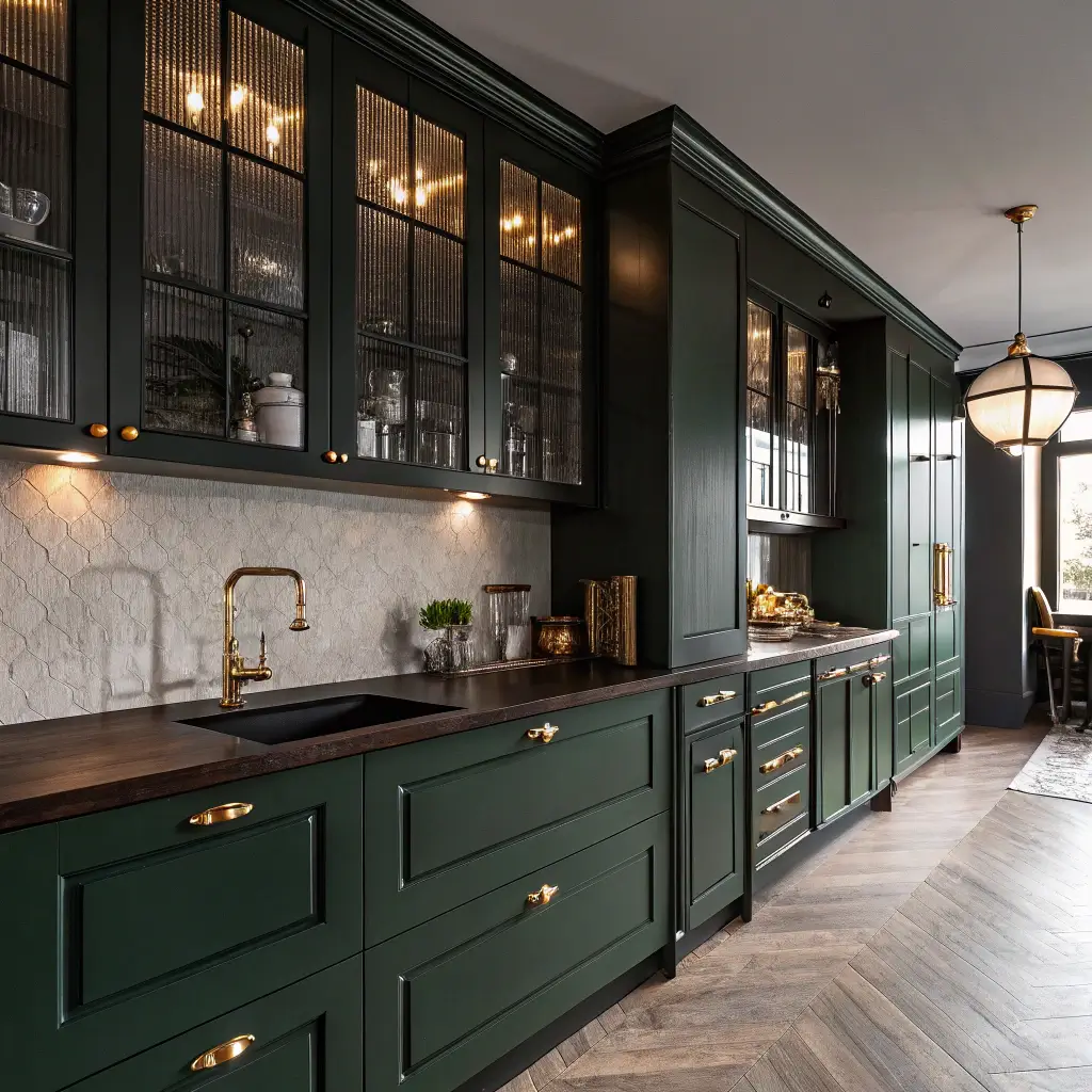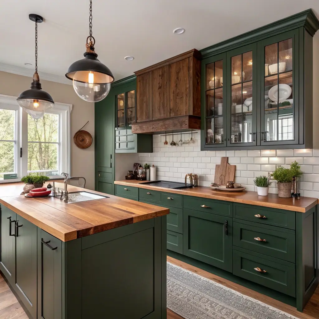 Elegant Forest Green Cabinets with Wood Accents