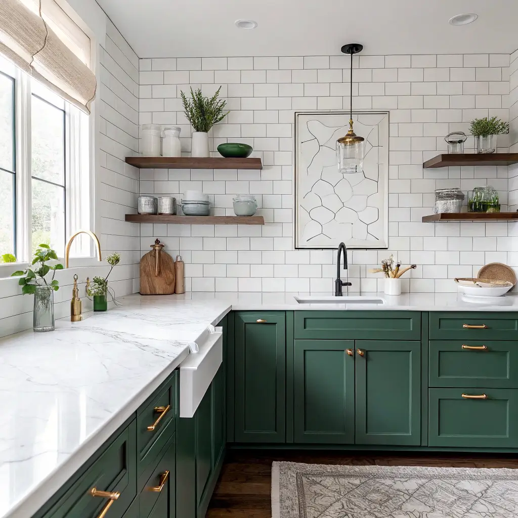 A crisp white backsplash makes forest green cabinets pop like nothing else. This classic combination never goes out of style because it just works.