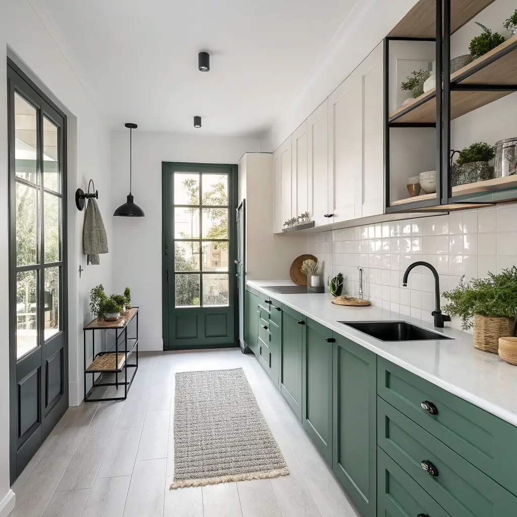 The secret involves using forest green on lower cabinets while keeping uppers light or open. This grounds the space without making it feel cave-like. Mirror backsplashes and under-cabinet lighting become your best friends here.