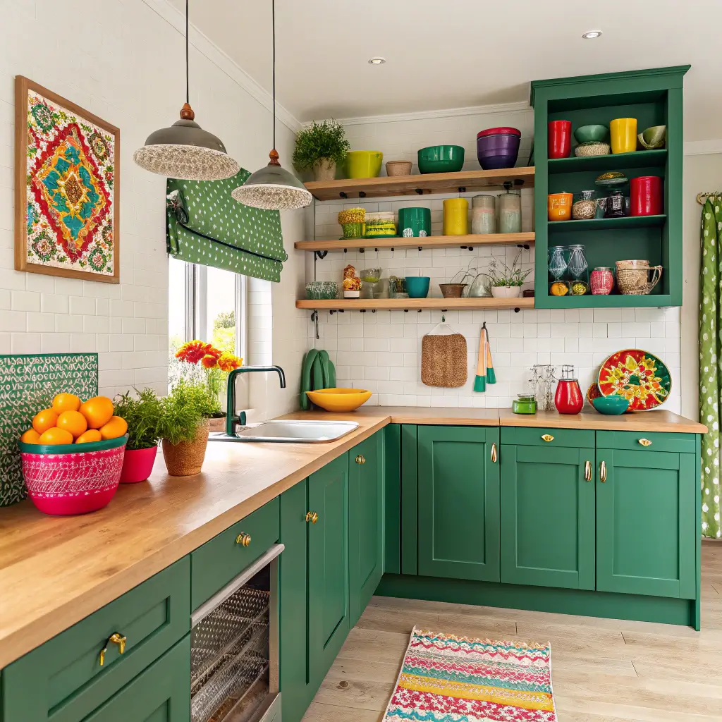 Bold Forest Green Cabinets with Colorful Accessories