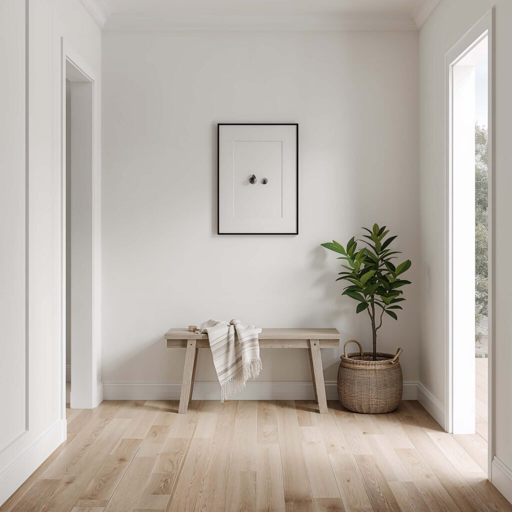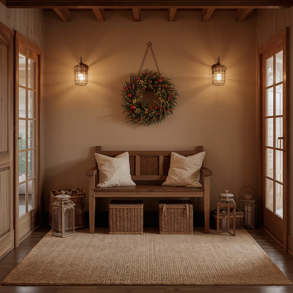 Wood tones should stay light and natural. Think birch, ash, or white oak. These woods reflect light and keep the space feeling airy even when it’s packed with winter coats.