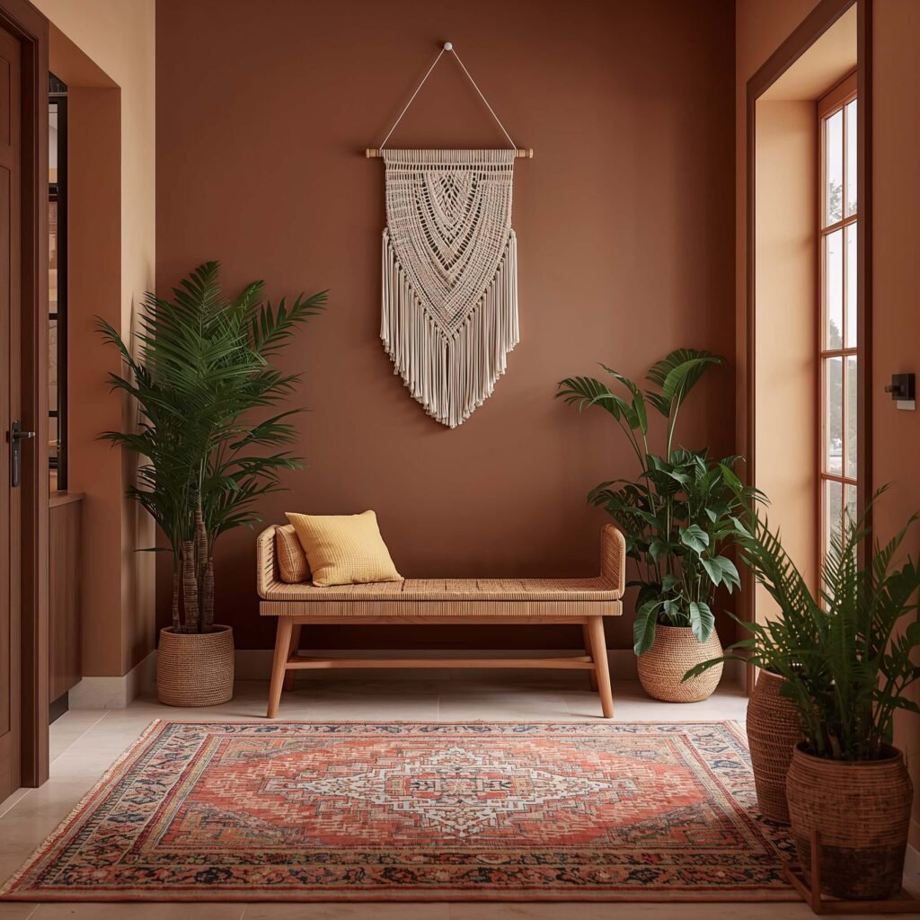 Boho style makes everyone feel instantly relaxed. That laid-back, collected-from-travels vibe works perfectly in foyers because it immediately tells guests they can chill out and be themselves. No stuffy formality here!