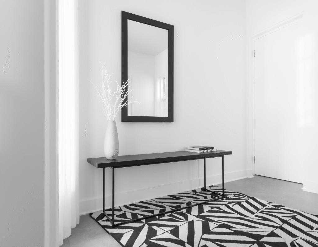 Consider a statement floor – black and white checkered tiles scream classic elegance. Can’t retile? A bold black and white rug works just as well. Add a black console table, white walls, and maybe one piece of black and white photography. Done!