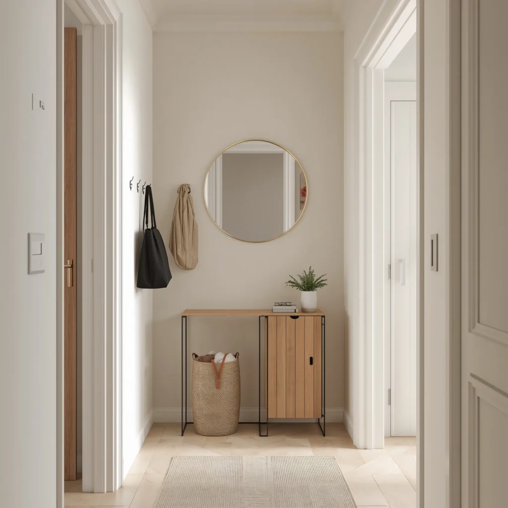 Mirror placement becomes crucial here. Position a large mirror opposite your door to instantly double the visual space. I hung mine at an angle to reflect light from my living room—suddenly my 4×6 foyer felt twice as big.