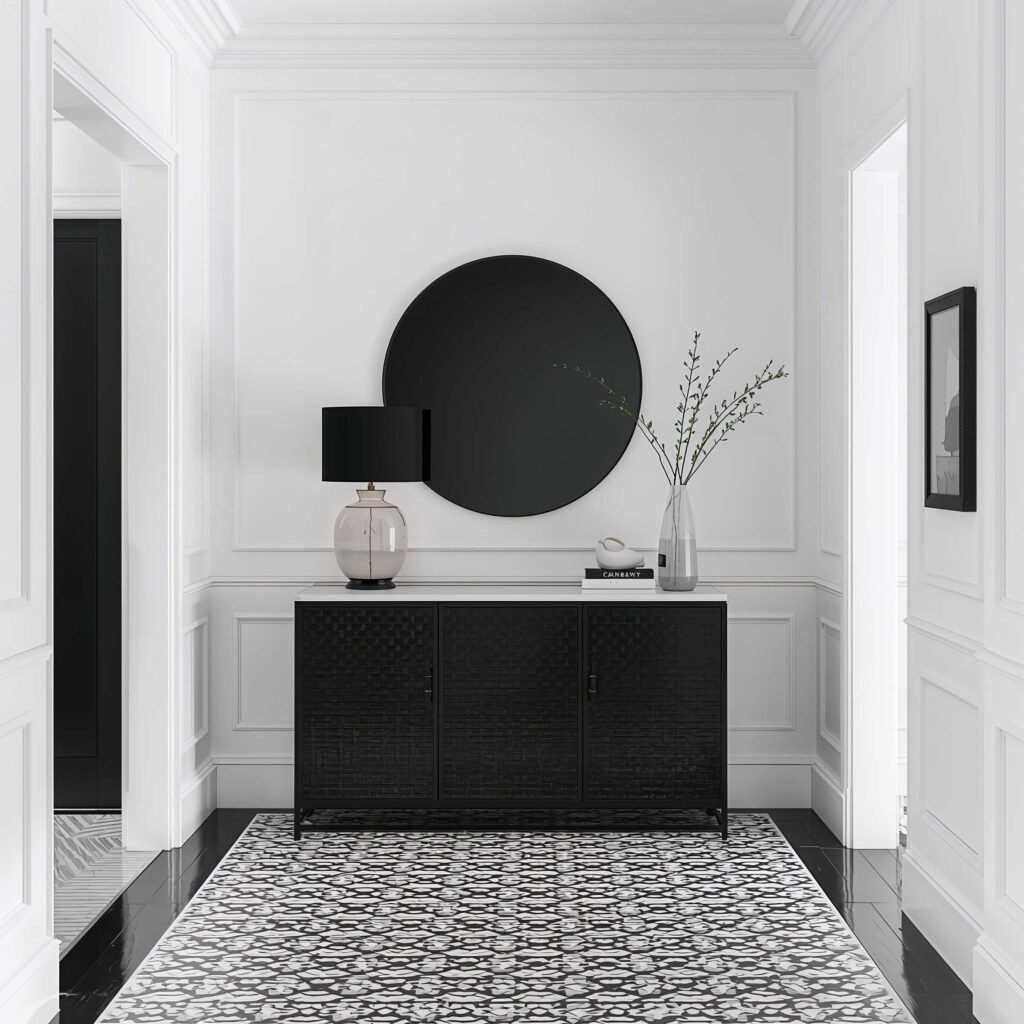 I helped my best friend design her black and white entrance last spring. We went bold with geometric floor tiles, and every single visitor comments on them. That’s the power of high contrast design.