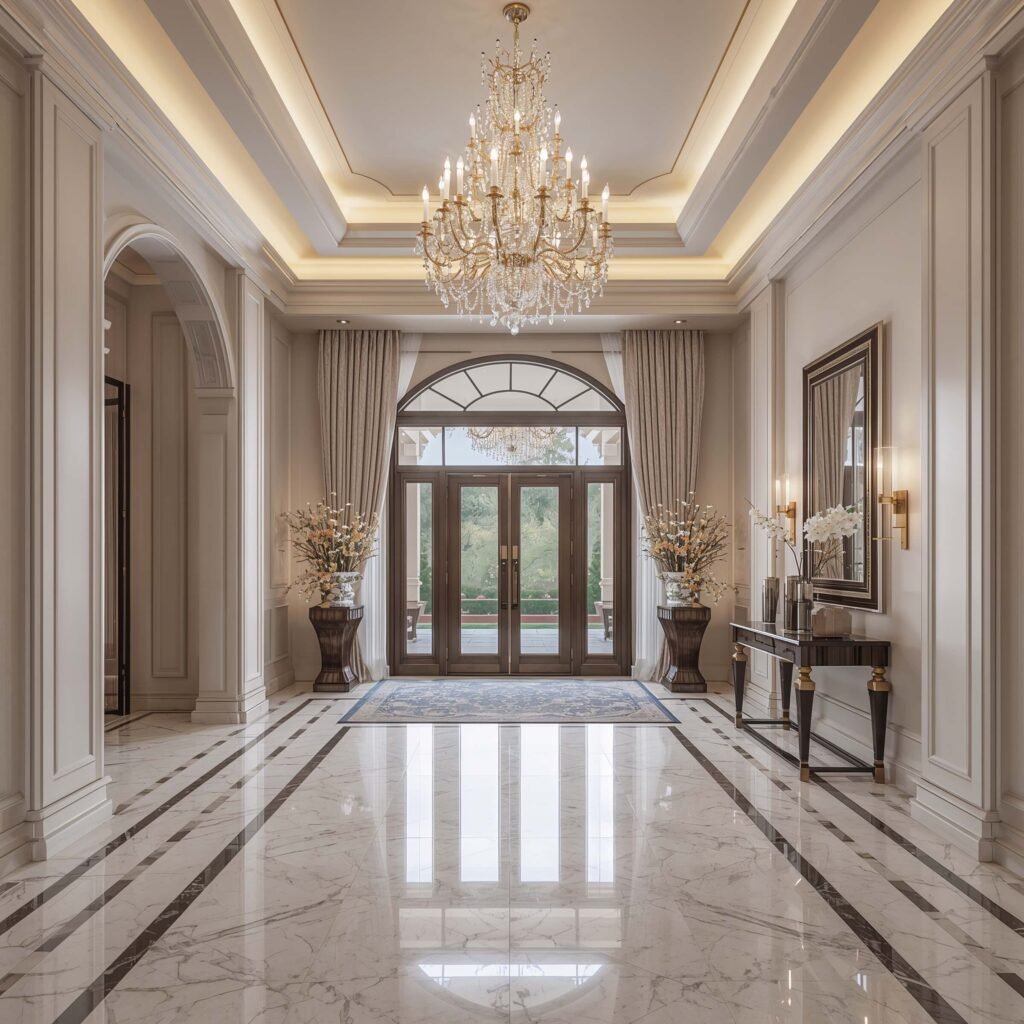 Lighting makes or breaks your marble foyer. Marble needs proper illumination to show off its natural patterns and depth. Install dimmers so you can adjust the mood from “grand entrance” to “intimate evening.”