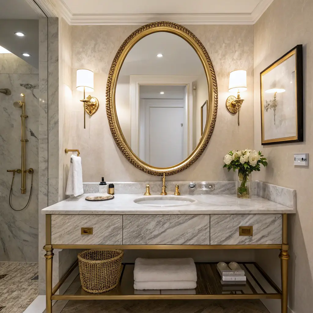 Curves are having a major moment in interior design, and oval and round mirrors instantly soften all those harsh angles in typical bathrooms. Every time I install a round mirror in a client’s bathroom, they’re shocked at how much friendlier the space feels.