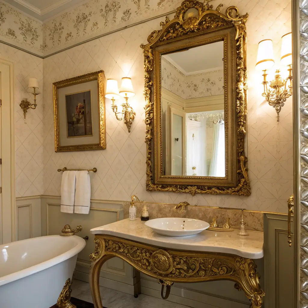 The trick to making ornate mirrors work in contemporary bathrooms? Keep everything else simple. Let the mirror be the star while your fixtures and accessories play supporting roles. A super ornate mirror above a minimalist floating vanity? Chef’s kiss.