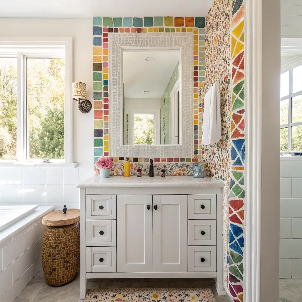 Want something truly unique? Mosaic tile frames let you create a one-of-a-kind mirror that perfectly matches your bathroom’s personality. These frames use small tiles—glass, ceramic, or even natural stone—arranged in patterns around the mirror.